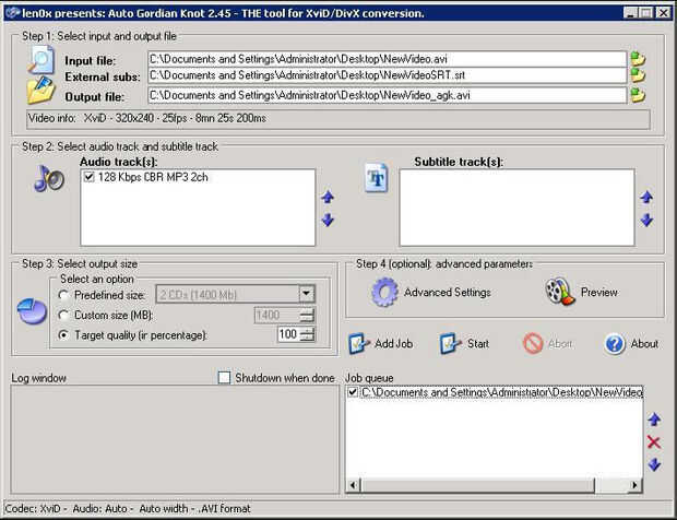 Después de instala el AutoGK, iniciar el proceso de conversión, haga clic en el botón "Input File" y seleccione el archivo de video original de tu disco local. Golpear Ctrl + F8 en su teclado para mostrar un campo de "Subs externos". Haga clic en el botón de "Subs externos" y seleccione el archivo SRT que guardaste de Overstream. La ubicación predeterminada del archivo de salida debe estar bien, pero puede cambiar si lo desea. Seleccione "Calidad de destino (en porcentaje)" la opción de tamaño de salida y configurar la calidad de"objetivo" al 100 por ciento. Haga clic en el botón "Agregar trabajo" y luego el botón "Inicio". Usted tendrá que aceptar los términos de licencia GPL para el programa VirtualDubMod, y una vez que hayas hecho esto, puede iniciar el proceso de conversión. El proceso de conversión podría tomar hasta 30 minutos o más, dependiendo de la duración del vídeo, el tamaño del archivo, la velocidad de su procesador y varios otros factores. El archivo de salida final debe ser menos de 100MB o 10 minutos de duración, para subir a YouTube. Por lo tanto, quizás tenga que experimentar con los ajustes para reducir el tamaño del archivo en consecuencia, o puede dividir un video largo en secciones y contabilizarlas por separado.