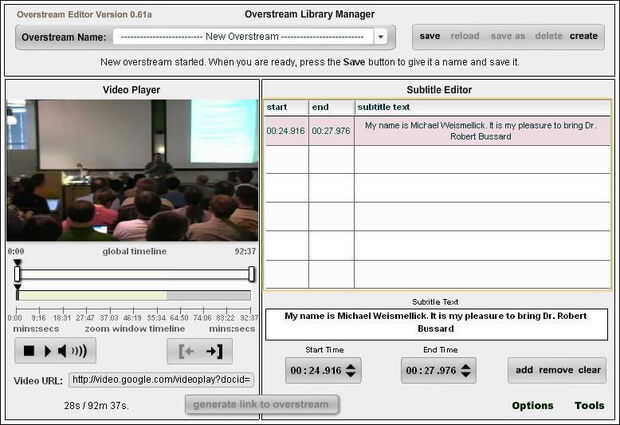 Después de iniciar sesión Overstream (recuerdas para crear una cuenta de usuario de Overstream, correcto?), haga clic en el enlace Create Overstream. Una vez que el administrador de biblioteca de Overstream carga, haga clic en el enlace "Crear". Copiar y pegar la URL de tu video de Google en el cuadro de diálogo video URL. Tan pronto como tu video demuestra para arriba en la ventana del reproductor Video Overstream, puede empezar a subtitular. Para crear el archivo de subtítulo Overstream, simplemente cortar y pegar las secciones de texto de su transcripción en el cuadro "subtítulo". No olvide aplicar el apropiado Inicio y fin de los tiempos.