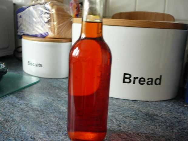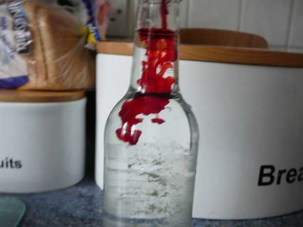 Llene la botella con agua sobre a mitad de camino hasta el cuello, dejando espacio para el corcho. Color del agua se puede utilizar colorante alimentario rojo y amarillo o si no tienes los colores adecuados puede utilizar tinta de bolígrafos de punta de fieltro. Uso más amarillo entonces rojo porque rojo es un color mucho más fuerte.