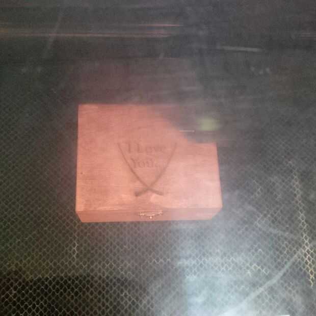 Tener mucho cuidado a la caja de debajo del área donde el láser corta el patrón del centro. Podría ser una buena idea de hacer un test de correr a 0% de potencia, o cubierta de la caja con una pieza delgada de madera de desecho para tener una idea de donde va el patrón.
