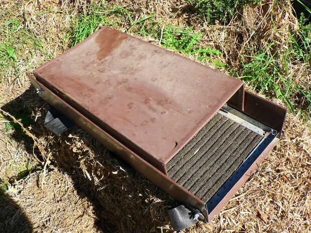 Una vez que usted ha hecho todo lo seguro, y han pegado en la alfombra y coloca la alfombra donde va a ir, puede colocar las dos piezas juntas y marcar donde quieres las bisagras. Quería que los dos lados para doblar "en sí mismos" así que puse el perno como cerca de la mitad de las "paredes" como sea posible. Usted también quiere poner el punto de pivote como cerca del borde de la pieza interior como sea posible. Si el pivote no está cerca del borde, la parte interna llegará a la parte exterior en vez de resbalar más allá.