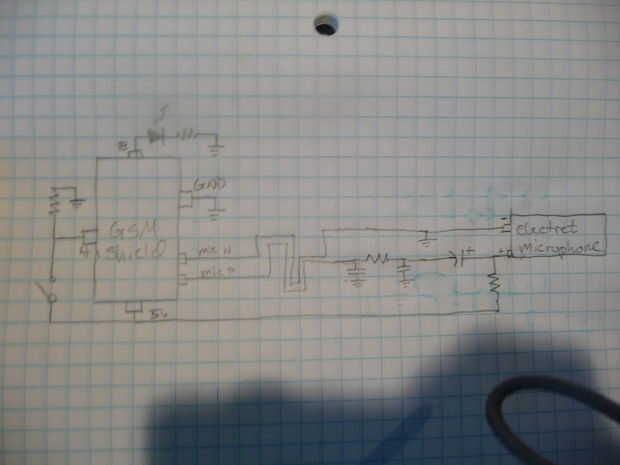 Utilice uno de los cables de puente para conectar el cable del interruptor al pin de 5v. Conecte un cable puente y un plomo de la resistencia de 100K ohm al otro cable del interruptor. El puente de alambre está conectado al pin 4 en el escudo GSM.