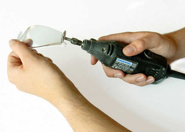 Corte cuidadosamente los templos de las gafas con la dremel o sierra para metales. Se recomienda utilizar otro par de gafas al utilizar una dremel. Después de eso puede Afile las fresas con un poco de lija de la dremel o usar un papel de lija.