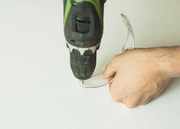 Cuando este paso se realiza puede utilizar el taladro con la broca pequeña o una aguja para perforar un par de agujeros en los lados de las gafas. Taladré 5 agujeros. Asegúrese de que vas lento en este paso, porque no quieres las gafas a crack. Realizar los orificios también lo suficientemente grandes como para que la aguja pase a través. Los agujeros se utilizará para fijar la cinta de velcro a las gafas.