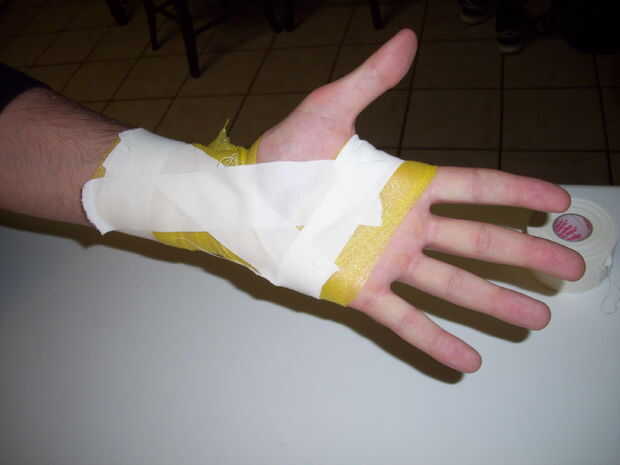 Aplique 2 tiras de cinta de anclaje a anclaje formando una X.  Esta X es lo que va evitar la hiperflexión o hiperextensión, así que poner la X en el lado de la palma de la muñeca para prevenir la hiperextensión, o poner la X en la parte posterior de la muñeca para evitar la hiperflexión.