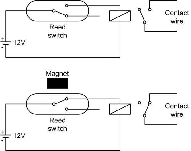 El esquema muestra como conectar. Estoy mostrando un interruptor reed con un contacto alterno, que esto puede ser útil, aunque el relé generalmente también tiene un contacto alterno. Usted puede elegir si quiere el coche para funcionar con o sin el imán eligiendo otro contacto en el interruptor de láminas o el relé.