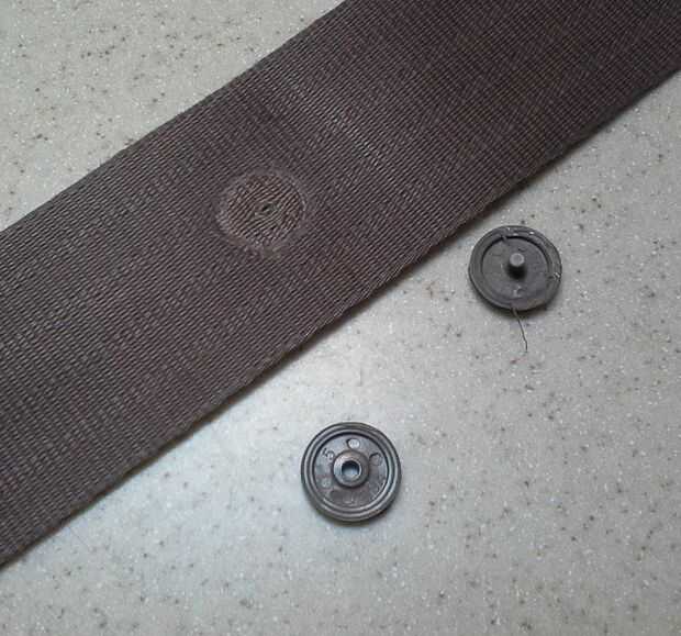 Para quitar este botón, trabajar con mucho cuidado unas tijeras entre un lado del botón y la correa. Insisto, Muy cuidadoso! La idea es conseguir entre las capas para que el botón se puede apalancar aparte.