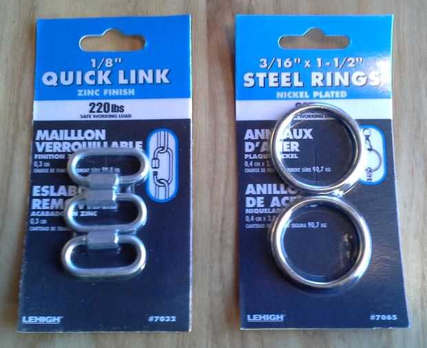 Anillos y enlaces pueden encontrarse por las cadenas de ferreterías. He incluido un cuadro para la referencia. Los anillos que encontré fueron clasificados para 200 libras un pedazo, y clasificaron a los enlaces rápidos para 220 libras un pedazo. Estos eran los más fuertes enlaces que pude encontrar en la tienda. Que tenga que llamar a unos pocos lugares para encontrar enlaces más fuertes. Estoy en ese peso pero creo que esto estaría bien para la mayoría de las personas ya que todo peso de una persona no debe ser en un extremo de una hamaca.