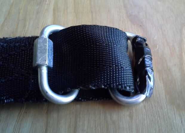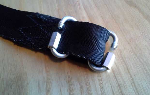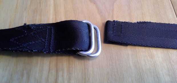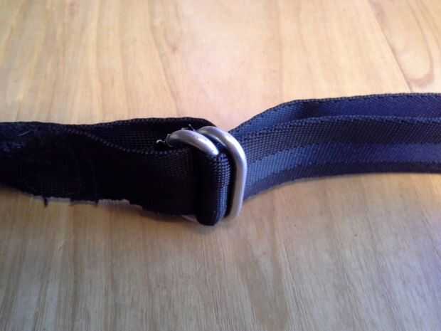El primer método (no se muestra) es tirar algunos correa a través de dos anillos y luego atar la correa en sí mismo. La correa podría ser cosida a sí mismo en vez de atado.