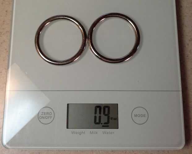 Incluí una imagen de los elementos en una escala de referencia. Tenía la escala en onzas cuando tomé las fotos pero no hace mucha diferencia. Un par de enlaces pesa 0,6 onzas y un par de anillos pesa 0,9 onzas.