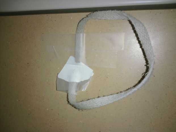 Cinta o pegar un pequeño trozo de papel hasta el final de la cadena. Esto servirá para separar los contactos de la tarjeta. Es conveniente cortar un trozo triangular de papel (apenas arrancó la esquina sobre de la tarjeta vino en) como usted puede deslizar la pieza de papel debajo de la cinta se pegue la cadena a la puerta cuando no está utilizando el dispositivo (como se muestra en la imagen).