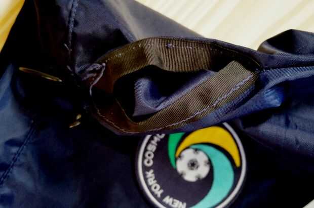 Rip parte superior a ambos lados del paquete de saco. El tamaño depende de cuánto las manos; Necesitaba ~ 5 pulgadas (~12.7 cm). Cortar dos piezas de cinta (longitud debe doble lo que arrancó para arriba), doblar la cinta a lo largo, de coser en la abertura, creando una especie de brazalete. Sí, sé que soy un terrible sastre.