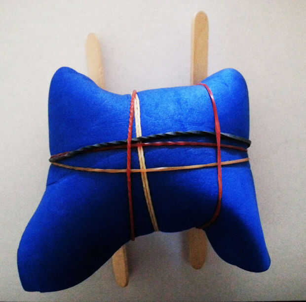 • Utilizando la cadena anudada gomas, fijar el huevo a los dos palitos, tal que el huevo se eleva un poco de la tierra