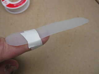Corte una tira de plástico de una sección recta de la jarra de leche y lavar para eliminar cualquier residuo.  Mi banda fue de 4-1/2 "x 3/4" para una mano hombre adulto.  Cortar dos trozos de cinta adhesiva alrededor de 4" de largo y cuelgan libremente desde un estante o mostrador.  Conecte el extremo de una pieza de cinta hacia uno de los extremos del plástico.  Poner el plástico en la parte superior del dedo lesionado para que aproximadamente 2/3 del se extiende más allá de la punta de los dedos.   Envuelva la cinta alrededor del dedo para garantizar el plástico.