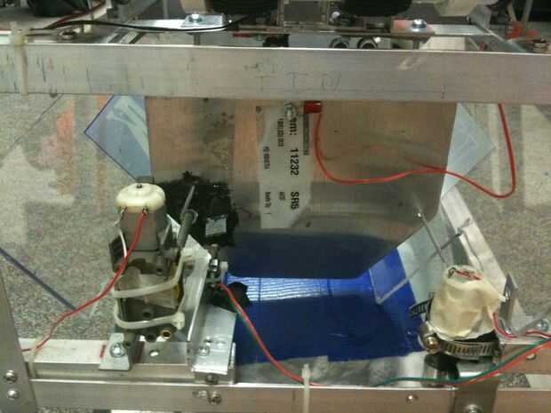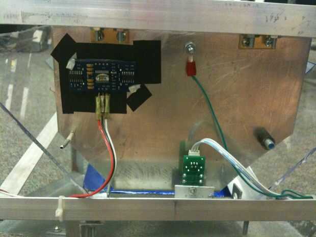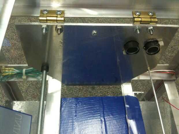 Otra placa se une al otro lado del marco, enfrente de la placa móvil. Esta placa está unida con bisagras en la parte superior de la placa. Un interruptor de límite se coloca detrás de esta placa. Cuando el bottle/can se insertan en esta placa, gire y pulse el interruptor, el Arduino de señalización que la botella es tocar ambas placas y para parar el motor. Un cable está conectado a cada placa para crear el interruptor de la conductividad. Un sensor de ultrasonidos también se une a la placa basculante. Enviará una señal de que va a rebotar fuera de la placa, medir la longitud de la botella/puede entre las placas.