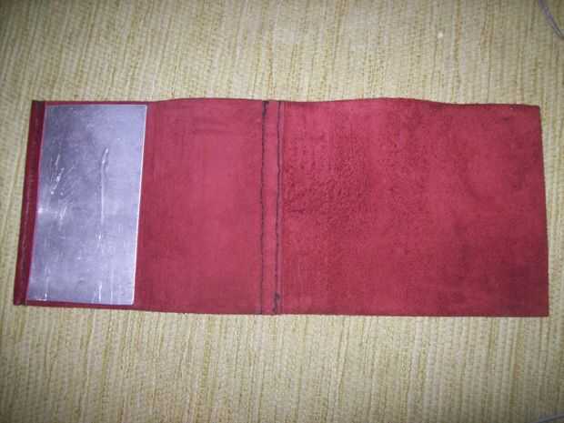 Podría pegar su placa de soporte a la piel pero prefiero coser en. Marcar un borde de metal cada 7mm, mi hoja de aluminio suave para que un pequeño clavo y un martillo firme fueron utilizados para marcar el punto y proporcionar un centro para el taladro.