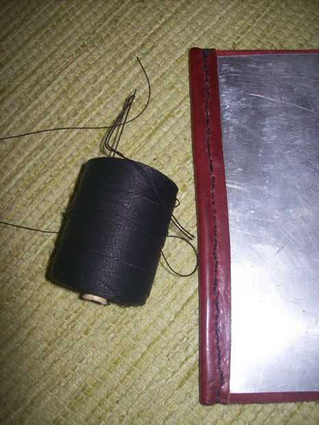 Me parece mucho más fácil de coser cuando los agujeros están hechos con taladro o traspasados con un clavo de cuero. Obligando a una aguja a través de dos espesores de cuero de 2mm corre el riesgo de ajustar una aguja y apuñalar a una mano. Así que marcar agujeros de 7mm aparte y taladrar o perforar.