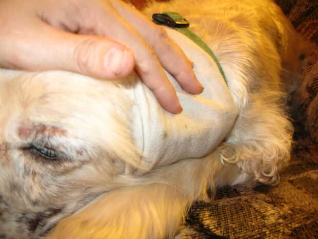 Llevé una camiseta de manga e hizo una cubierta para la cabeza, nos hemos sido llamarlo "cofias"--para evitar que sus oídos aleteo cuando él tira su cabeza. Esperemos que los antibióticos dará inicio en breve y tendrá alivio, pero mientras tanto se pone a usar una cinta interesante.