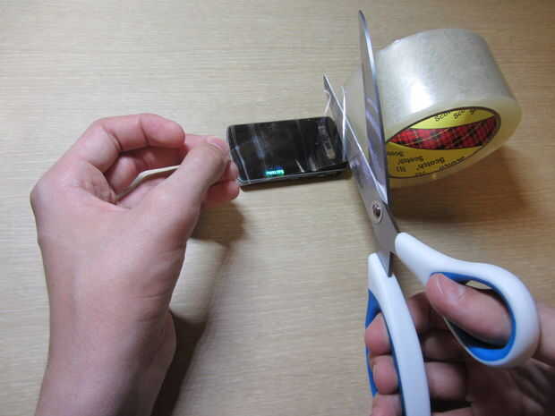 Corte la cinta de embalaje para caber su pantalla. Trate de evitar tocar la parte pegajosa de la cinta con los dedos.