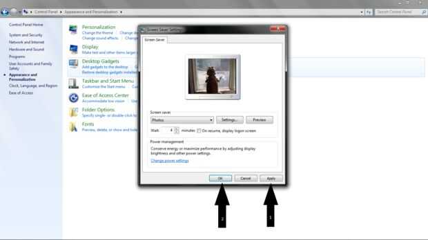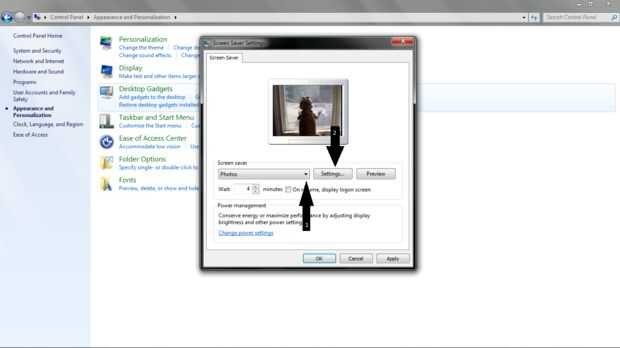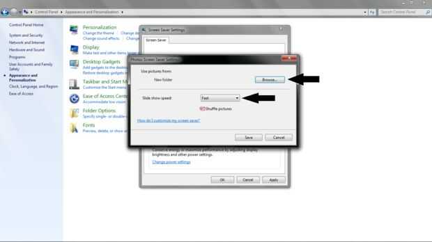 OK ahora para la parte difícil, abrir el panel de control de equipos (el programa no la computadora real ' o ') entonces encontrar aspecto > Personalización > protector de pantalla. De la lista desplegable elegir "Fotos" y luego haga clic en modificar la configuración. Busque la carpeta que guardó los dos. PNG, después de que ha seleccionado se presione "ok" y modificar la configuración de velocidad de la pantalla descuentos "rápido" (haga "Shuffle" que no se enciende)...