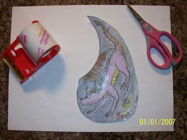 Ahora entiendo que esto puede parecer un poco extraño pero un rollo de cinta de embalaje y cinta cuidadosamente el papel cortado en una cuesta hacia abajo en la dirección como las tijeras rosa de la foto de abajo. Asegúrese de cubrir la cosa entera. La dirección de la cinta es muy importante. Si la cinta no es en el sentido correcto la persona que toca la guitarra se lio la cinta al que rasgueo con una púa. No te preocupes si tira de la cinta sobre el pedazo de papel. Después de grabar el corte alrededor de la selección la guardia de forma otra vez para deshacerse de la cinta sobrante.