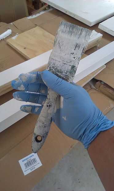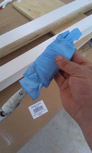 Desde el conseguir de un paquete de 100 guantes desechables he usado les para mantener mi clean(ish) manos. Funcionan muy bien para pintar! Así que, si mantener el cepillo en la palma de su mano. Usando el otra mano tire la muñeca sobre el cepillo y la mano en el guante. Las cerdas deben ser cubiertas por el guante.