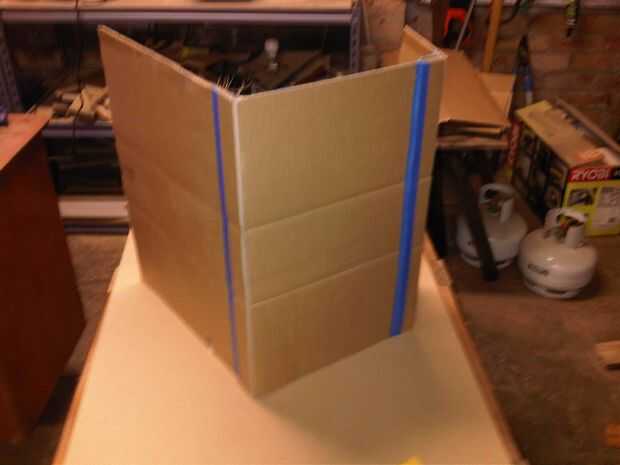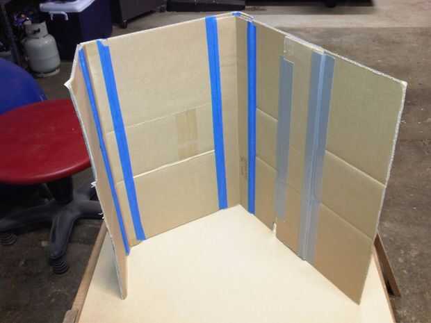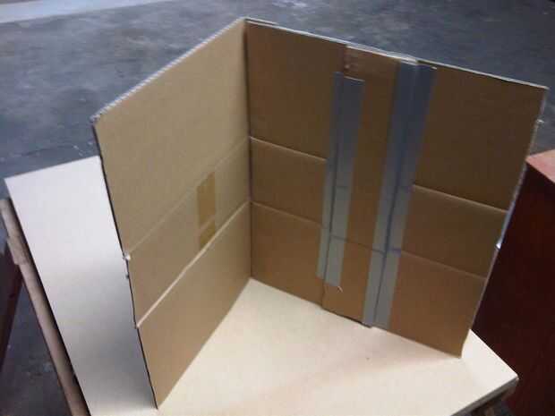 -Tiempo para el pedazo más pequeño de lado cartulina-toma esto y pégalo en acerca de un ángulo de 45 grados, llegando hacia adentro, a la pieza grande de cartón goingbehind no es la máquina. Por ejemplo, no aquel mencionado en el paso anterior.