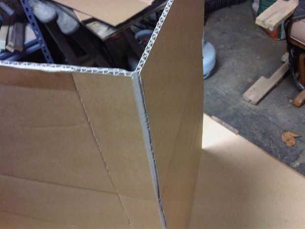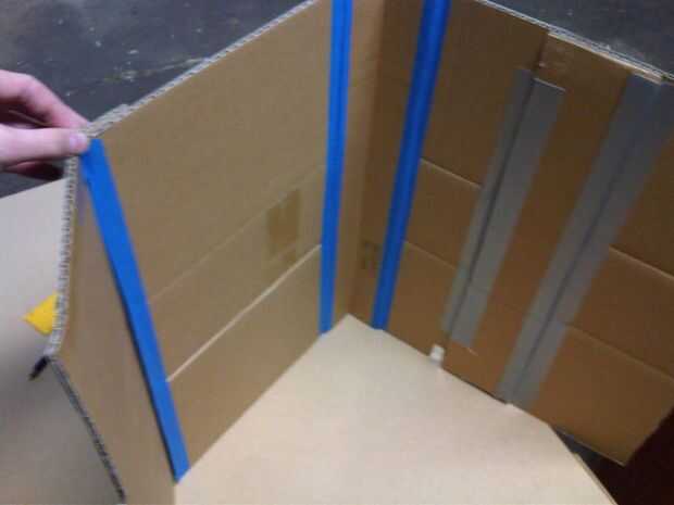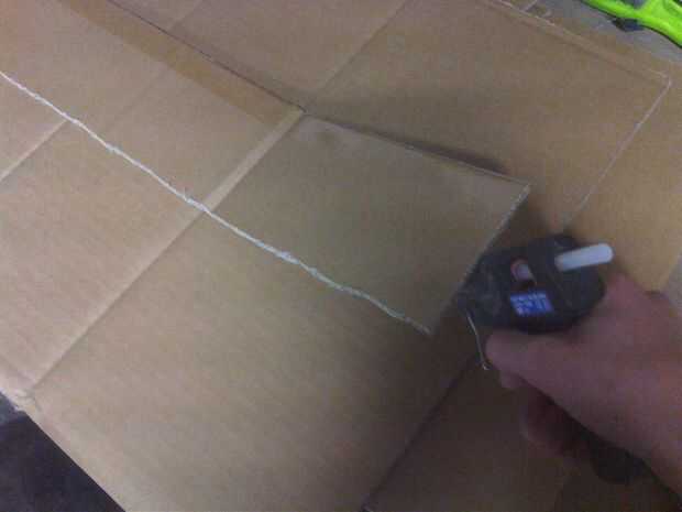 -Caliente pegamento en uno de estos en la parte interior de los pedazos más grandes de cartón y el otro en el exterior. Puedes usar también cinta adhesiva a lo largo de sus lados para mantenerlos fuertes i hizo esto porque no tengo muchos palitos de pegamento caliente.