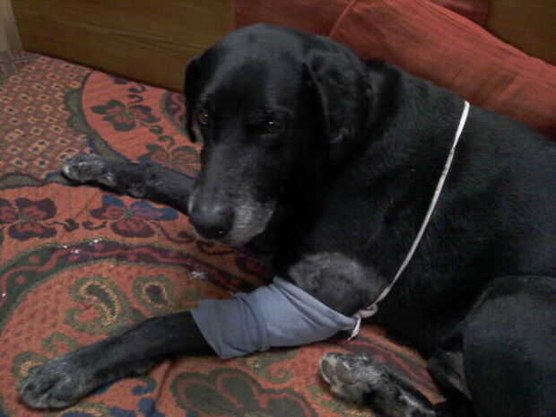 Mi perro Zorro tuvo que someterse a una cirugía la semana pasada. Tenía un tumor enorme en su codo que tuvo que ser quitado. La cirugía salió bien, pero terminó con unas puntadas. Esta izquierda el dilema de le impide sacar sus puntadas...