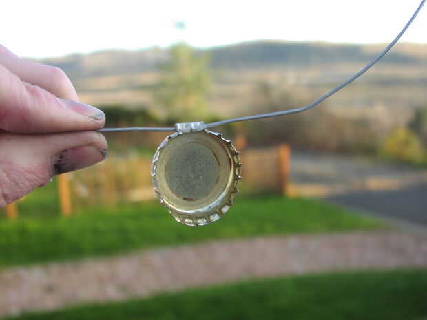 Luego, otra vez con las pinzas, cuidadosamente rodar la ficha en un tubo. No tiene que cerrar completamente, lo mantendrá un hilo en ella. (Si usted no puede conseguir que salga derecho, también podría crear la bisagra perforando dos pequeños agujeros en los lados de un casquillo sin cortar, como las divisas de aventura Up in.)