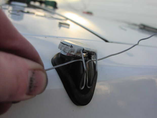 Doble las piernas de dos hilos para que la curva hacia abajo, conocer y dar la vuelta. Luego doblar el resto de las piernas hacia afuera, como brazos extendidos para abrazar el poste de la antena (que ellos). Prueba de ajuste y curva alrededor como sea necesario hasta que la mirada y la tapa más o menos centrado sobre el agujero. Alambre bastante indulgente.