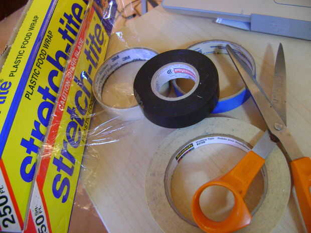 Pared respetuoso cinta-cualquier cosa que deje dosent marca y es removible Tijeras Plástico plástico - uh, cualquier tipo de plástico creo que... Cinta aislante - para las partes donde es necesaria la cinta flexible