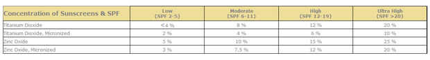 | Concentración de Protectores solares y SPF | Baja (SPF 2-5) | Moderada (SPF 6-11) | Alta (SPF 12-19) | Ultra alta (SPF > 20) |