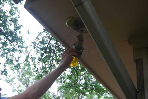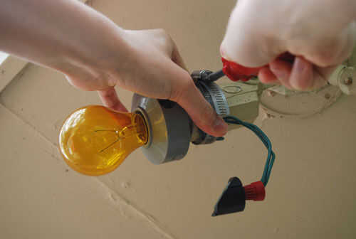 4 salir al exterior y fije la abrazadera metálica alrededor de la lámpara y coloque el cable debajo de la abrazadera.