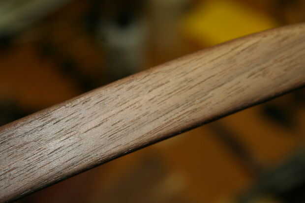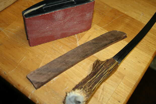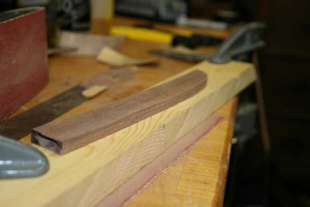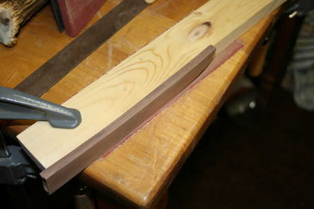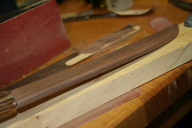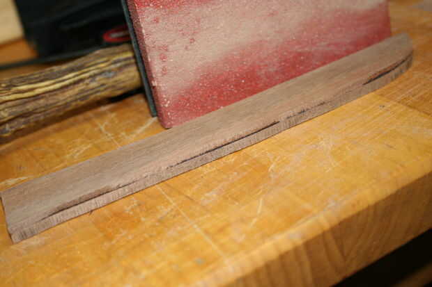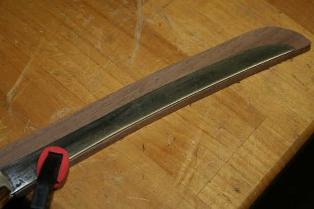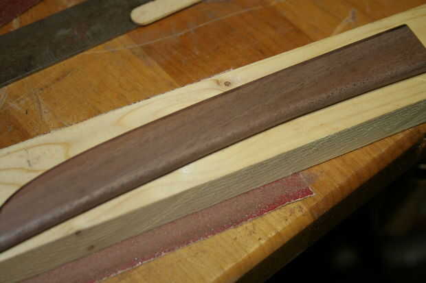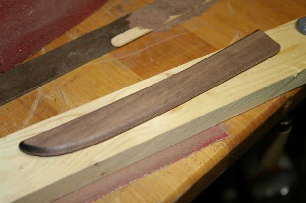 Después de retirar las pinzas recortar exceso de la Sierra de banda. Utiliza el cuchillo para trazar la línea de la parte posterior de la hoja disminuyendo la envoltura hacia abajo hacia la punta y recortar con la sierra antes de bloque de lo lijado a continuación, hizo lo mismo con el lado afilado. Sujeta papel de lija a la mesa debajo de un bloque cuadrado con bordes a arena el lado curvo para mantener cuadrados. Después de lijado basto, corrí a él muy con cautela en el enrutador para obtener buen esquinas redondeadas. Después de lo enrutamiento vez a mano arena que realmente no era mala en absoluto, con 150, 220, 320 y 400 de la arena se hizo en menos de una hora.