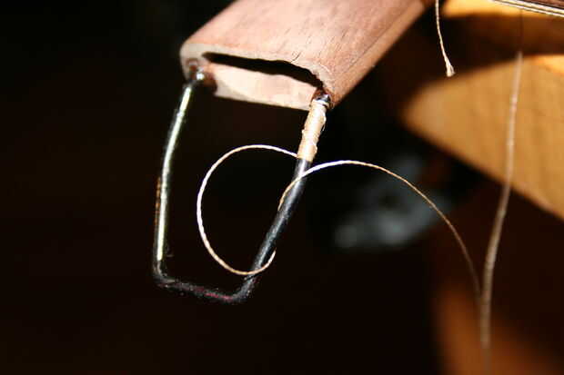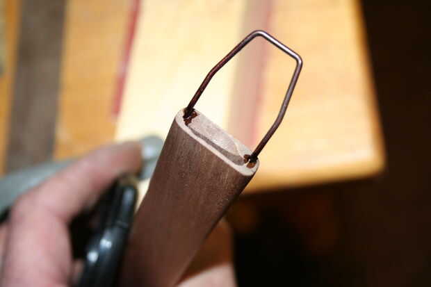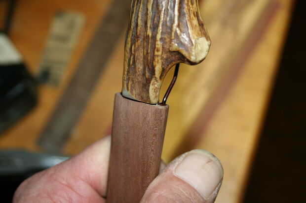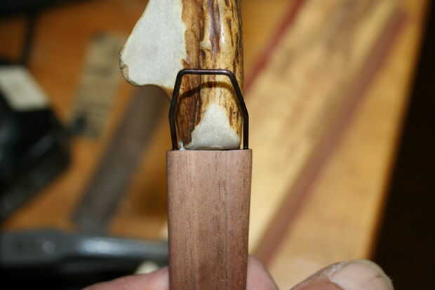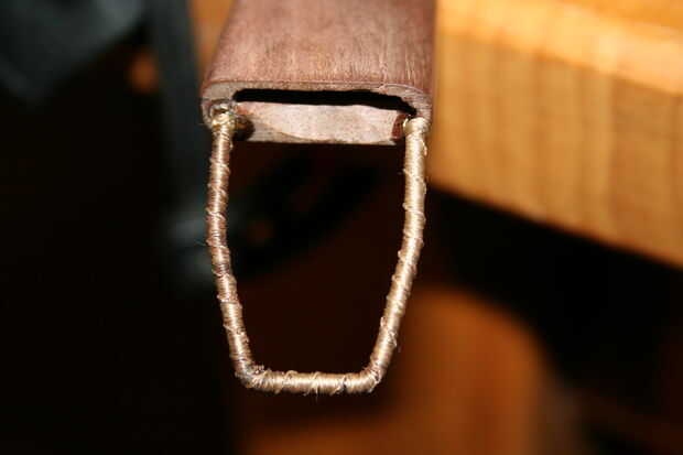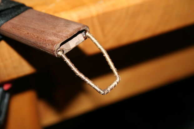 En este punto me di cuenta de que debería haber construido un "jefe" en la espalda para espaciar un lazo de la correa de la vaina; es mucho más grueso en el lado que se enfrentarán en mi mango de cuchillo. Algún pensamiento más mostraron que el mango del cuchillo también es bastante pesado, así haciendo top heavy. Más pensamiento dicho utilizar alambre, por lo que había doblado una pieza de 1/16 alambre para encajar y en ángulo hacia arriba para bajar el centro de gravedad del cuchillo por alrededor de una pulgada. Coloreado el alambre con un marrón rotulador maltratados los extremos y súper pegado en 2 orificios perforaron en la parte superior de la vaina. Entonces pensé que dándole más fuerza y belleza envolviendo con hilo en medio enganches dándole un efecto de espiral (desbastar la superficie de un buen agarre para epoxy), radiestesia con pegamento, coloreado con mi rotulador y luego recubierta con epoxi transparente. Lo siento por falta de fotos, pero esto sucedió sin recordar a dispararles. Además de envolver la parte superior de la vaina con polipropileno de la guita que también coloreado con mi rotulador marrón. La presilla se recicló de correas sobre una vieja correa de cuero que se le dio nueva vida con un poco de grasa de oso. Yo también envuelto sobre puntadas de los bucles para el seguro y para cubrir habilidades de costura pobre jajaja. Cubrí la guita con semi brillo de poliuretano, y el resto de la vaina tiene acabado satinado (antes de él fue envuelto).