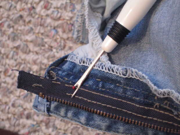 Utilice al abreojales para quitar la cremallera (figura dos). Corte a través de una puntada a la vez, rasgando sobre cada tercer punto. Después he arrancado unas puntadas de esta manera puede comenzar tirando de la cremallera de la tela para hacer las cosas más fácil. Se trata en gran medida la parte más difícil de este proyecto. Mantener la fe.