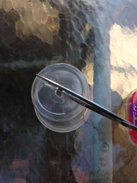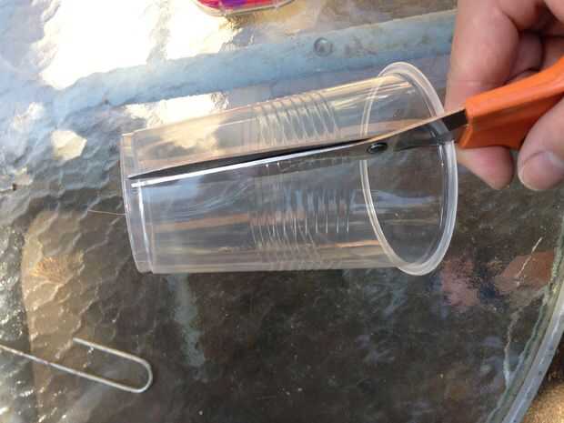 Use una tijera o cuchilla y corte en un lado y en la parte inferior hasta que puede abrir la Copa por la mitad.