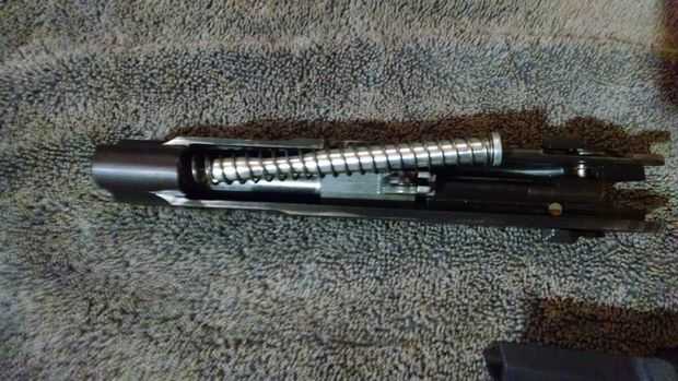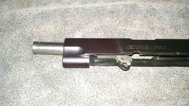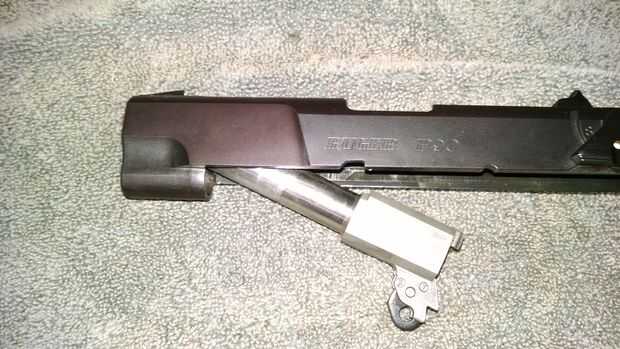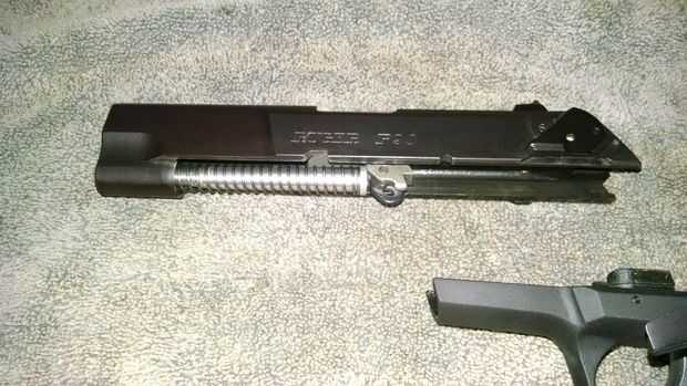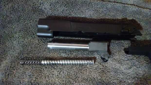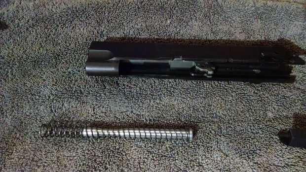 Quite el resorte presionando hacia adelante y luego Ángel a un lado y retirar. Deslice el barril hacia adelante ángulo y tirar hacia fuera.