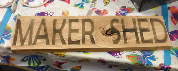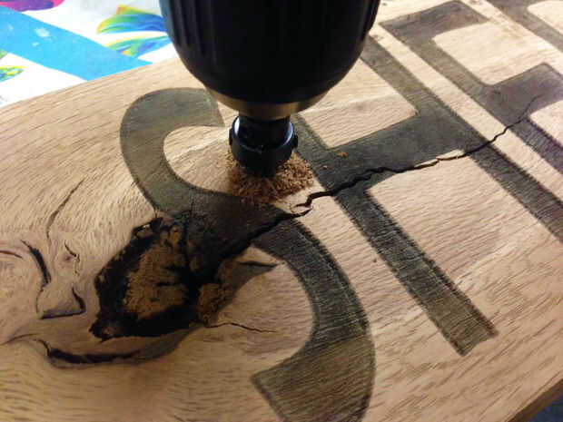 A continuación, necesitamos taladrar puntos de fijación. Porque es una losa bastante pesada del roble, teníamos que usar una broca bastante de gran alcance. Se utilizó un poco avellanado para que la señal se arreglaría muy bien. Somos un makerspace y tenemos que ser capaces de tomar orgullo en nuestro trabajo!