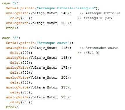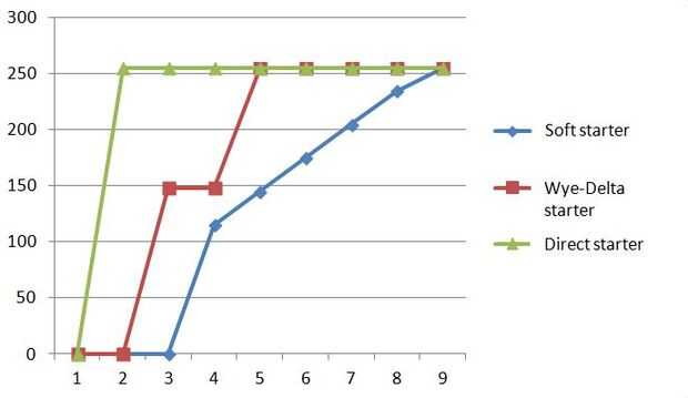El arranque del motor eléctrico se probará en tres formas. Primer a partir de 100% de la energía, en segundo lugar a partir de una configuración de Wye-Delta, eso significa que a partir de 2/3 de la energía total y finalmente un arrancador suave. Las gráficas muestran el comportamiento del motor en los tres casos y en la tabla el sus valores.