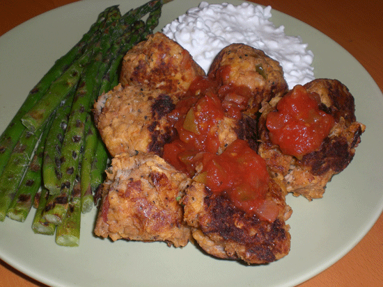 Por último, antes de servir salsear algunos salsa la parte superior de las bolas de proteína. Ahora ha completado una comida deliciosa rica en proteínas (119g) para la atleta de formación.