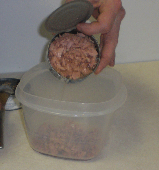 A continuación, usted hará lo mismo la otra lata de atún hasta que (2) latas de atún en el recipiente de mezcla.