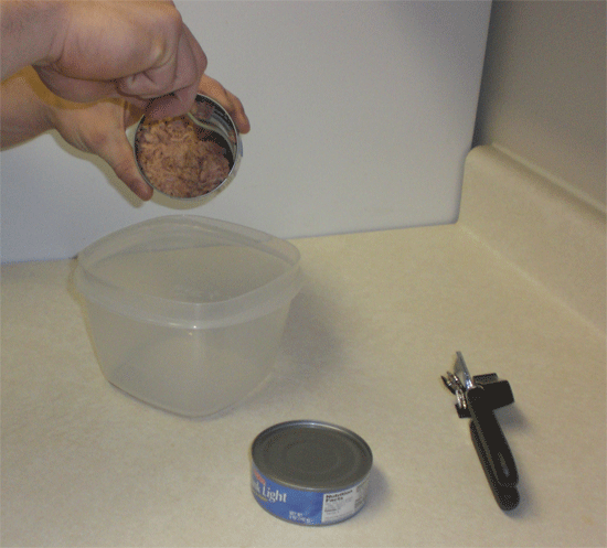 Nuestros primeros pasos en la preparación de las bolitas de atún es establecer un tazón. He escogido un recipiente de plástico transparente para mi conveniencia y que al espectador. Vamos a empezar por conseguir nuestro bisturí puede y quitar las tapas de dos latas de "atún en agua del". Puede entonces utilizar su utensilio de mezcla apropiado, que mina es una cuchara grande y usar para obtener del atún de la lata y el plástico envase de mezcla.