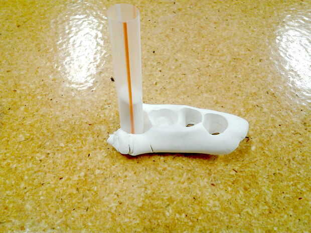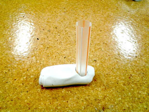 Miren su paja y estimar cuánto masilla vas a necesitar. En mi caso se trataba de la mitad de la palanca de 4oz. Mezclar en sus dedos (probablemente debería usar guantes para esta parte), hasta que el color sea uniforme. Entonces Mecharla en la parte inferior de la paja boba hasta que llegue a la marca que hiciste antes en la parte superior. Usted sólo unos 15 minutos antes de que este material se endurece lo suficiente se han complicado trabajar con. Y esto es diferente para cada tipo de masilla epoxi, así que asegúrese de leer las indicaciones en el suyo y Ayuste veces.