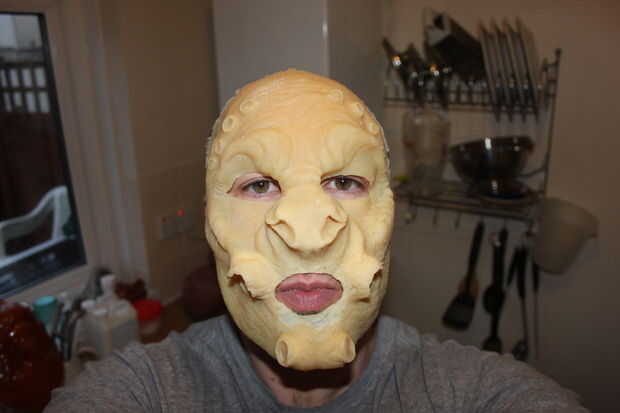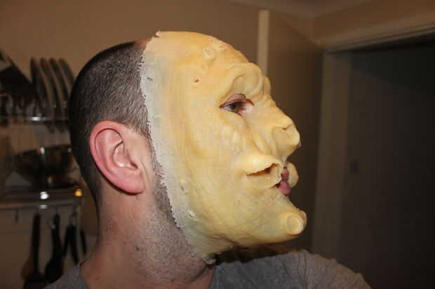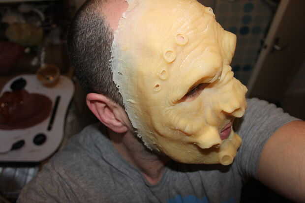 Todo el proceso toma sobre una 10 horas no incluye la configuración inicial y aclarar procesos, ya que tiene que diseñar, esculpir, refinar la escultura, la arcilla del molde y luego realizar la máscara de látex.