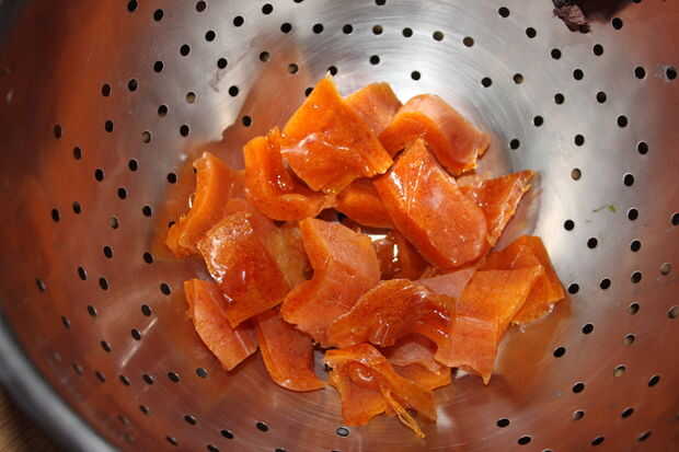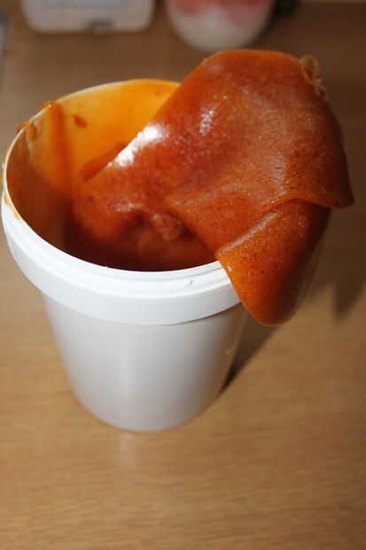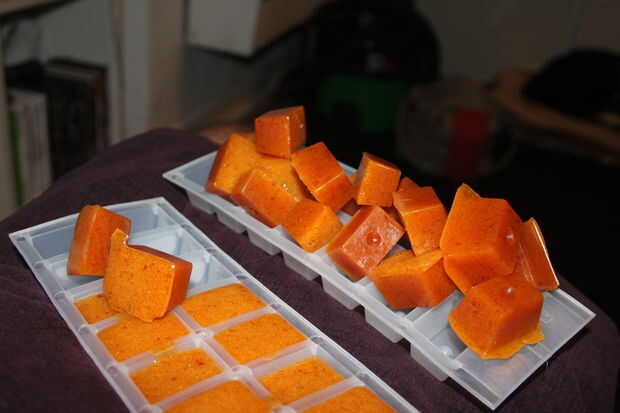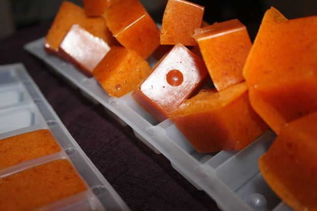 Cortar molde de gelatina en trocitos y meter en el congelador para su uso futuro o volver a fundirlo y verter en cubiteras luego el congelador para más bloques de Aguilón del hombre para su uso posterior