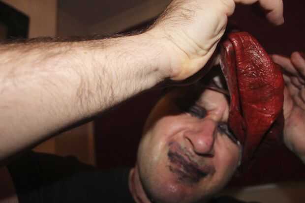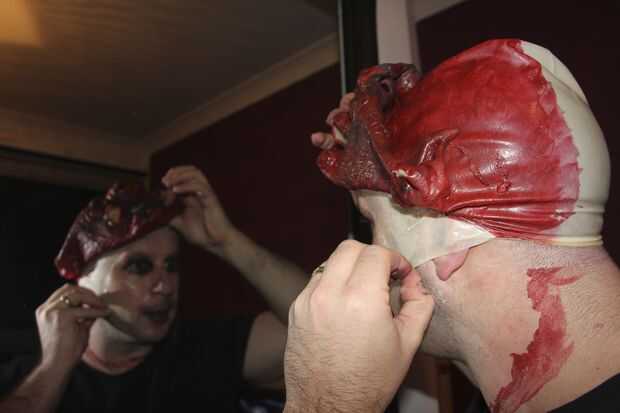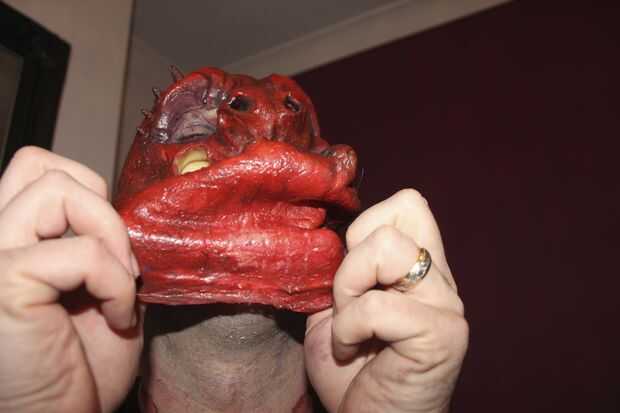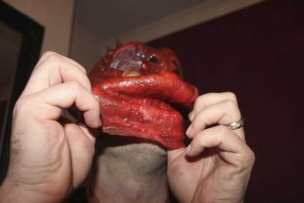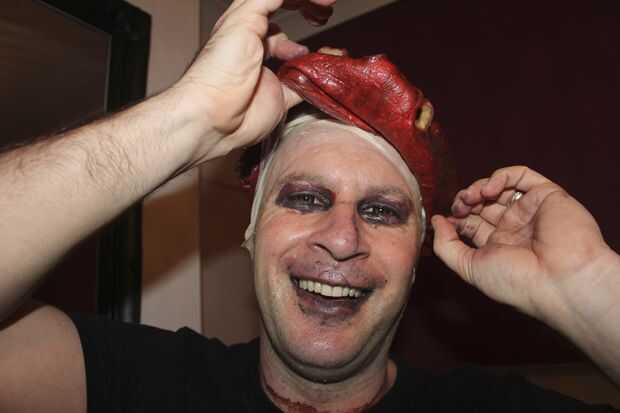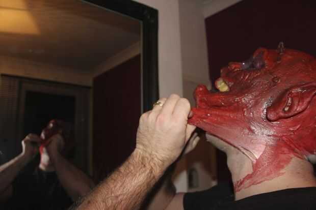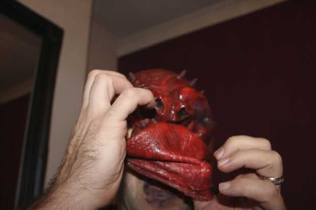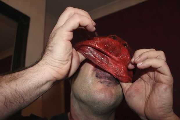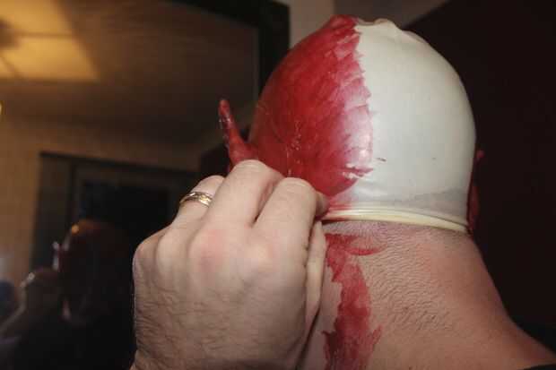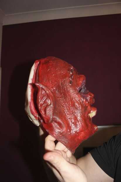 Después quité el látex que se puede ver bastante que mucho salió en una pieza completa y con un poco pegamento adhesivo Pros Aide podría volver a aplicarlo y añadir más sangre o maquillaje para disimular las costuras.