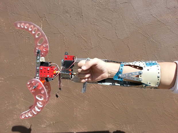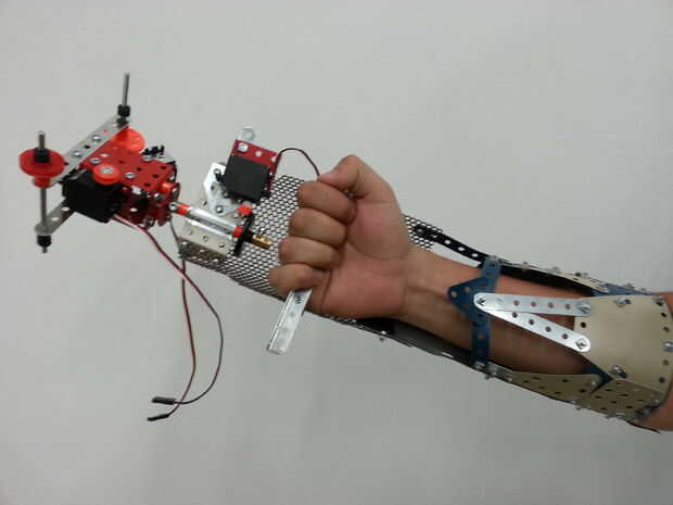 El accesorio del brazo fue hecho para encajar mi brazo, teniendo en cuenta que esta parte es solo demostrar el principio de que la pinza de montaje de un brazo real. Tenemos que conseguir a alguien sin una mano y hacer un vínculo real con sus medidas.