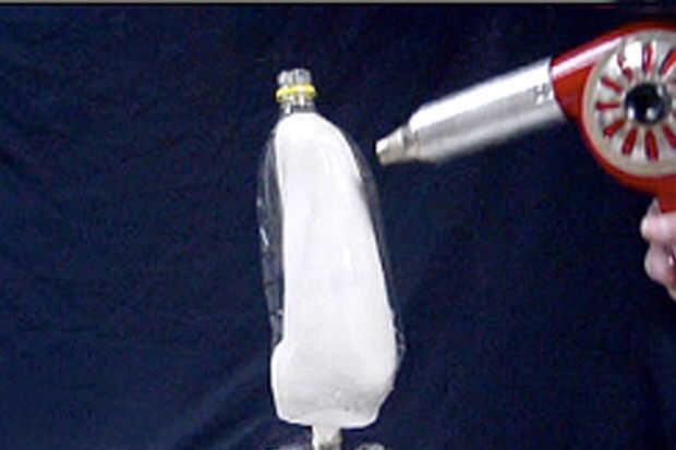 2. calentar la botella hasta que se ajusta a la forma del modelo de yeso. Este proceso dura unos 15 minutos. Asegúrese de que la botella ha conformado plenamente a la forma del modelo de yeso.